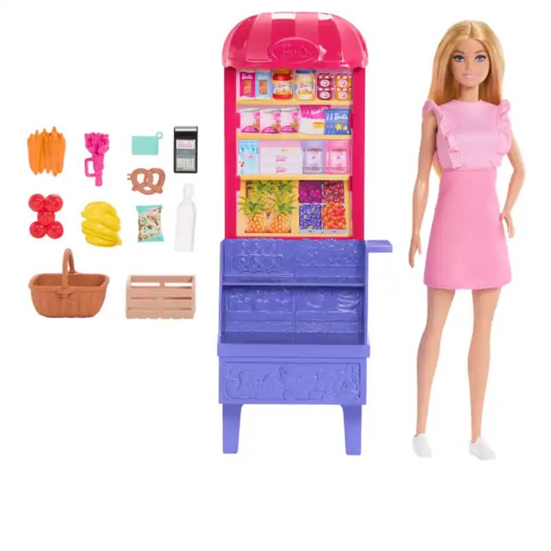 • همراه با چندین وسیله مثل یه غرفه‌ی کوچیک و رنگارنگ، سبد خرید، میوه‌هایی مثل سیب و موز و دستگاه کارت‌خوانه و ..