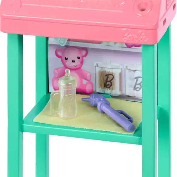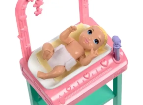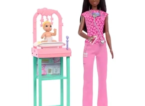 باربی یه لباس صورتی با طرح قلب پوشیده و گوشی پزشکی دور گردنش داره؛ کنارش یه نوزاد کوچولو هست که روی میز معاینه می‌شینه و با اسباب‌بازی ستاره‌ای بالای سرش سرگرم میشه تا باربی دکتر اونو معاینه کنه. این ست با اکسسوری‌هایی مثل شیشه‌ شیر و تب‌سنج تکمیل شده و برای بازی‌های تخیلی و داستانی عالیه. این ست تجربه‌ی یه مطب کوچیک نوزاد رو با میز معاینه و قفسه‌ی نگهداری لوازم رو برای بچه‌ها فراهم می‌کنه.