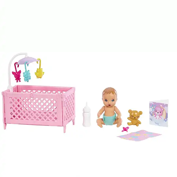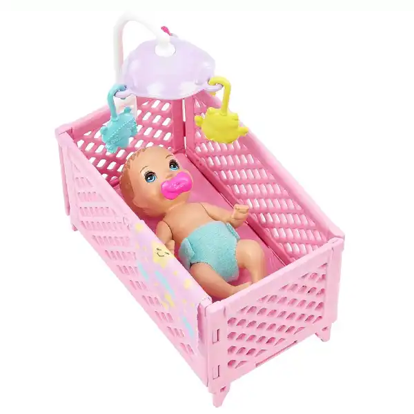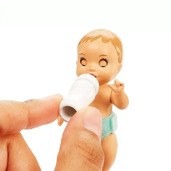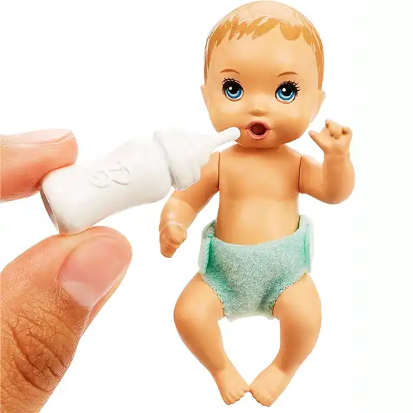 پرستار مهربون با لباسهای خوشرنگ و خوشگلش آمادهست که از نوزاد بانمک و خوابالو مراقبت کنه. جالبه که بدونید وقتی باربی به کوچولو، شیشه شیر یا پستونک میده، چشماش بسته میشه!