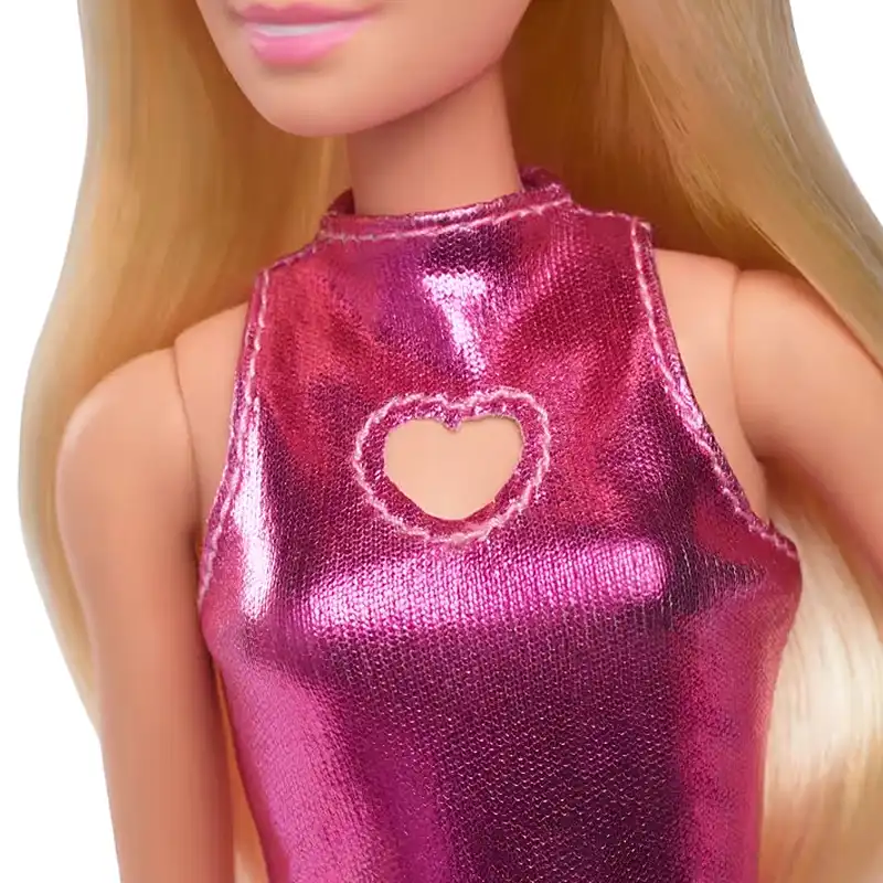 عروسک بلوند با پیرهن صورتی براق که روش برش قلبی داره، یه باربی بهروز و مدرن هست.
