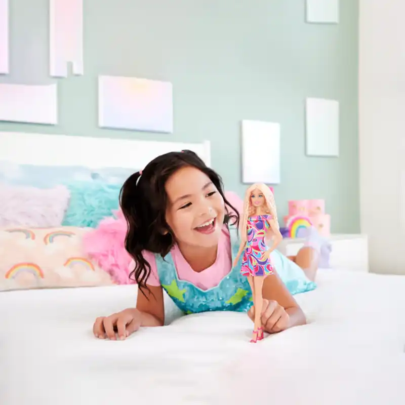 عروسک باربی مو بلند بلوند یه مدل خاص از سری (Fashionistas) فشنایستاست، ظاهرش برای ادای احترام، شبیه به باربی معروف به اسم Totally Hair سال 1992طراحی شده. موهای بلوند خیلی بلند و موجدار (Crimped) یکی از بارزترین ویژگیهای این باربی هست. این عروسک یه پیراهن کوتاه و رنگی با طرح شلوغ و شاد پوشیده و استایلش با کفشهای پاشنهبلند و گوشوارههای بزرگ صورتی تکمیل شده. این محصول یه عروسک باربی جذاب برای بچههای 3 سال به بالاست.