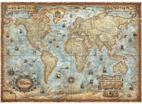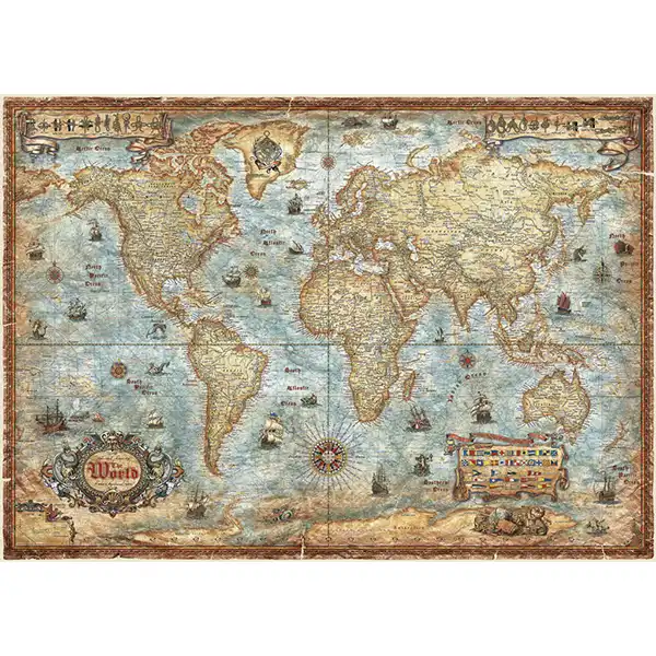این نقشه‌ی جهان که با دقت و تو سبک کهن و با جزئیات زیاد طراحی شده، کشورها و مرزهای زمین را همان‌طور که امروز از نظر جغرافیایی و سیاسی وجود دارند نشون می‌ده.