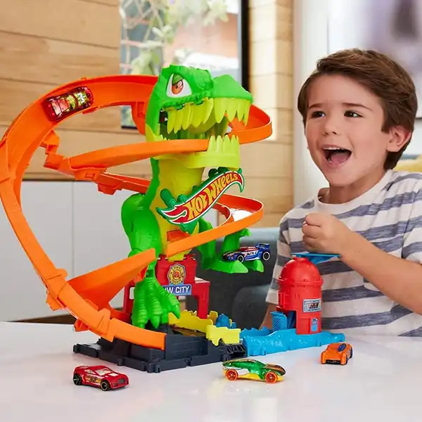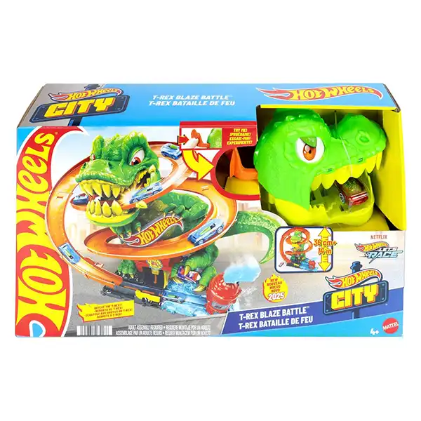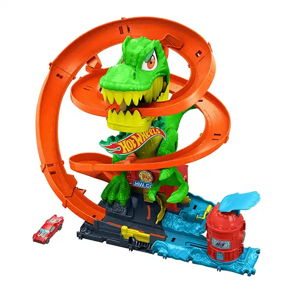 پیست هات ویلز مدل نبرد تی-رکس T-Rex Blaze Battle از سری CITY براساس نبرد حماسی در شهر هات ویلز طراحی شده. این ست کودکان رو به چالش می‌کشه تا ایستگاه آتش‌نشانی شهر رو از حمله یک تیرانوسوروس رکس (T-Rex) بزرگ و تهدیدکننده نجات بدن. این مجموعه شامل یک ماشین دایکست (Die-Cast) با مقیاس 1:64، مسیرهای پیست، یک پرتاب‌کننده قدرتمند و فیگور دایناسوره که بلافاصله شرایط رو برای بازی‌های پر سرعت و اکشن فراهم می‌کنه. این ست با هدف تقویت مهارت‌های ظریف حرکتی و بالا بردن دقت و مهارت زمان‌بندی دقیق در کودکان بالای 4 سال ارائه شده.