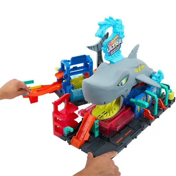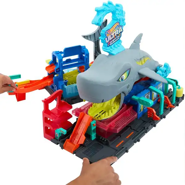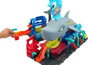 این ست شامل امکاناتی مثل غلتک فومی، دروازههای متحرک و بخش پارکینگه. بچهها میتونن ماشین رو وارد دهان کوسه کنن، با آب گرم یا سرد رنگ ماشین رو تغییر بدن و کلی خوش بگذرونن.