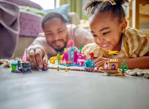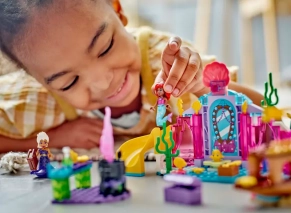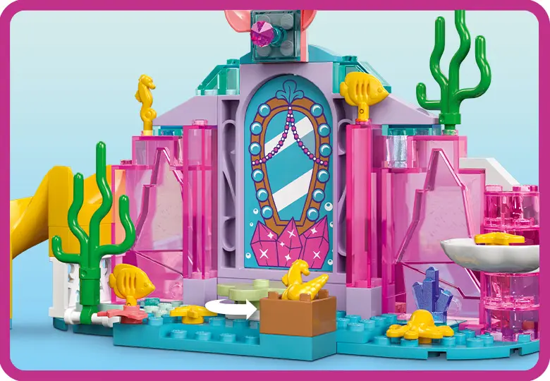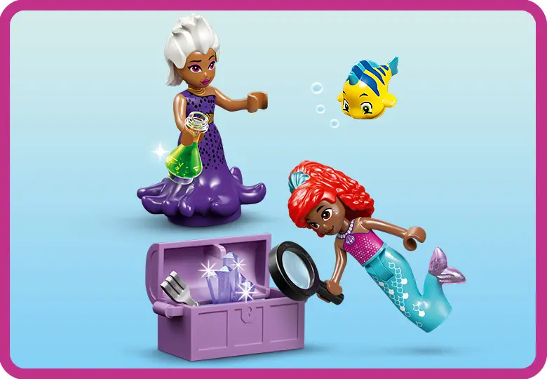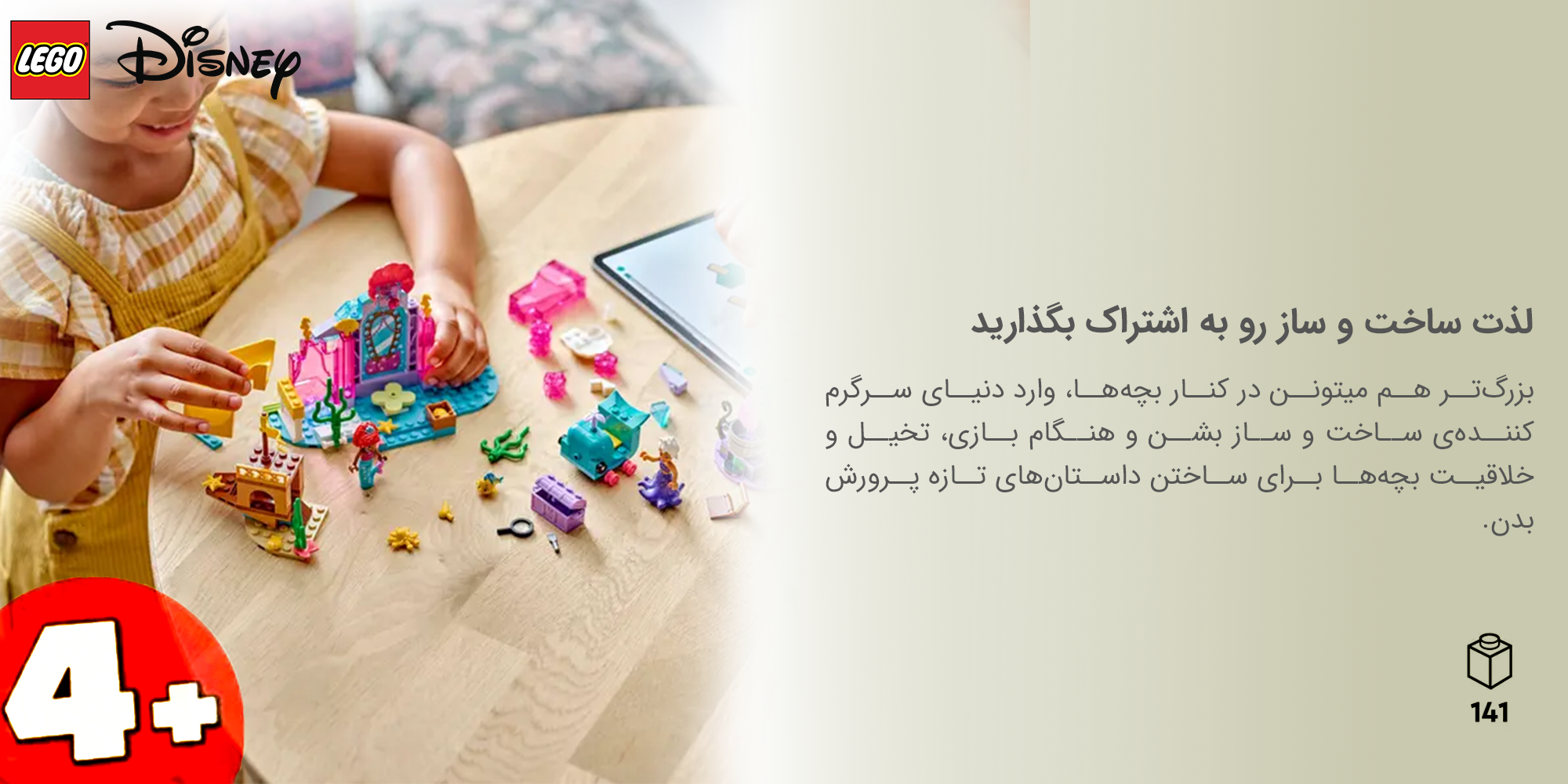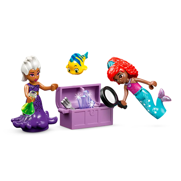 مجموعه لگو دیزنی شامل غار بلوری آریل، سکوی چرخون با پسزمینهی آینهای، سرسرهی دریایی، …و همینطور مینیدالهای آریل و اورسولا و مینیفیگور فلاوندر هست تا بتونید داستانهای دریایی و ماجراجوییهای خیالی خودتون رو بسازید و تجربه کنید.