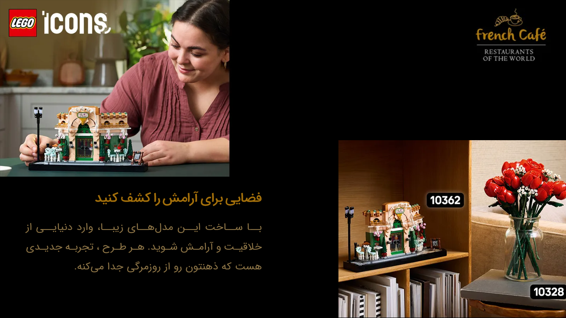 لگو آیکونز مدل 10362 کافه فرانسوی یه آیتم کلکسیونیه که می‌شه کنار کتابخونه یا تو ویترین گذاشت. این مدل پر از جزئیات معماریه، برای مثال، بالکن‌های کوچیک با نرده‌های تزئینی و گلدون‌های آویز پر از گل‌ که حال و هوای یه کافه تو خیابون‌های اروپا رو داره. وقتی در ورودی دولنگه‌ی کافه باز می‌شه؛ می‌تونی یه نگاهی به داخل  مرتب و دنج کافه بندازی.
