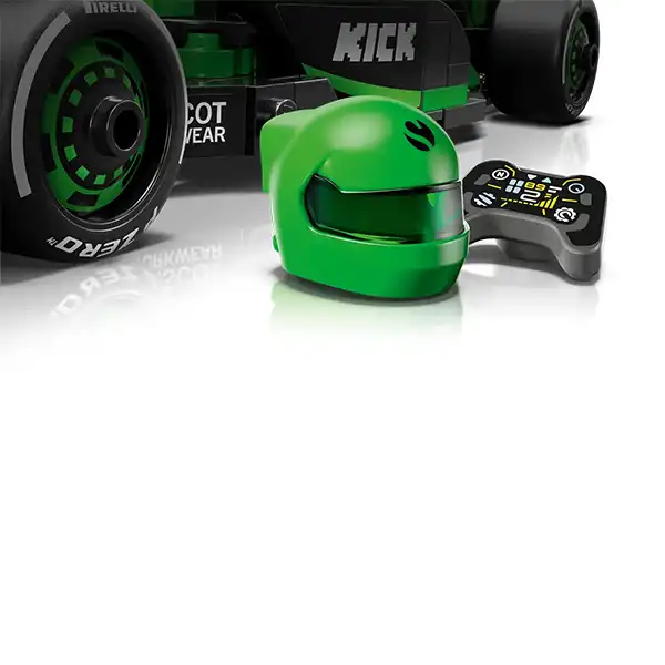 • یه مینی‌فیگور راننده با لباس رسمی تیم کیک سائوبر و کلاه ایمنی بال‌دار