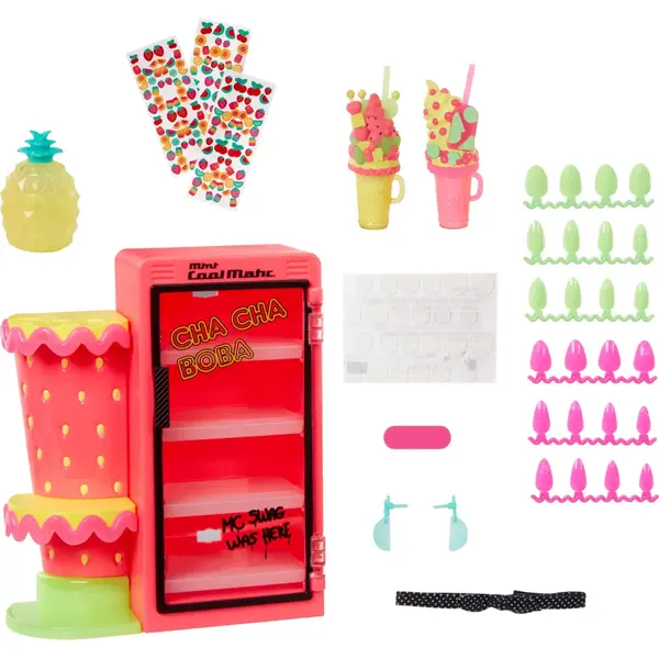 این ست بیشتر از ۱۵ آیتم داره که مهم‌ترین اون پیشخوان طراحی ناخن هست؛ بخشی که هم نقش یخچال کوچک رو داره و هم پیشخوان فروش میوه. ناخن‌های چسبی، لاک‌هایی با ظاهر اسموتی میوه‌ای، اکلیل، سوهان ناخن، چسب و استیکرهای تزئینی ناخن داخل این ست قرار گرفته‌. عروسک دارای مفصل‌های متحرک هست و دست‌های جداشونده داره که تعویض لباس رو ساده‌تر می‌کنه. موهای صورتی فر، لباس دو تکه با طرح میوه‌ای، کفش و گوشواره‌ها، شخصیت Pinky Pops رو کامل می‌کنن. این عروسک ژست‌های قشنگی میگیره.