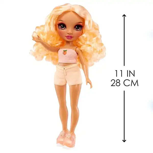 جورجیا یه استایل اسپرت و تابستونی داره که یه تاپ کراپ بامزه که روش یه هلو کوچولو گلدوزی شده رو با یه شورت کتان همرنگ ست کرده. چیزی که این عروسک رو خاص می‌کنه، موهای بلند و پرپشتش هست که فرهای درشتی داره و رنگش ترکیبی از تناژهای مختلف نارنجی روشن و کرم پودریه.