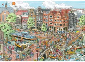 این پازل آمستردام رو در شلوغ‌ترین و بامزه‌ترین حالتش نشان می‌ده. کانال‌های معروف شهر، خونه‌های باریک و رنگارنگ هلندی و دوچرخه‌هایی که همه‌جا دیده می‌شن، در کنار شخصیت‌های کارتونی و صحنه‌های طنزآلودِ مخصوص Frans Le Roux یه تصویر زنده و پرانرژی ساختن. معماری دقیق و واقعی شهر با رنگ‌های روشن و جزئیات فراوان ترکیب شده و هر گوشه تصویر پر از اتفاقات کوچک و خنده‌داره. نتیجه، یک صحنه شاد و پرجزئیات از قلب آمستردامه که چیدن اونرو به تجربه‌ای سرگرم‌کننده و جذاب تبدیل می‌کنه.
