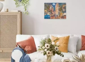 تصویری هنرمندانه و شاعرانه از شهر پیزا در شب هنگام. این طرح ترکیبی از معماری کلاسیک ایتالیا، رنگ‌های گرم و چشم‌اندازی آرام است که حس قدم‌زدن در خیابان‌های زیبای پیزا را تداعی می‌کنه.