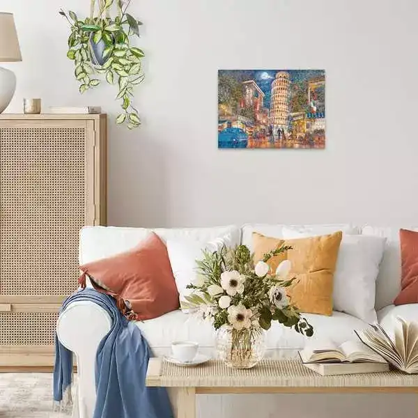 به شب دل‌انگیز پیزا سفر کنید! نور ماه، برج کج و نمای شهر در کنار ساختمان‌های پر از نورِ خیابان. تصویری آرام، زیبا و مناسب برای یه سرگرمی لذت‌بخش و تمرکز ذهنی در خانه.
