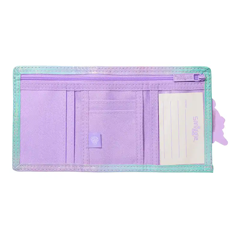 کیف پول Smiggle طرح یونی کورن یاسی یه کیف کاربردیه دخترونه‌ست که یک محفظه زیپ‌دار برای نگهداری سکه و اسکناس، پنج محفظه بدون زیپ برای کارت و یک محفظه شفاف برای کارت شناسایی داره.